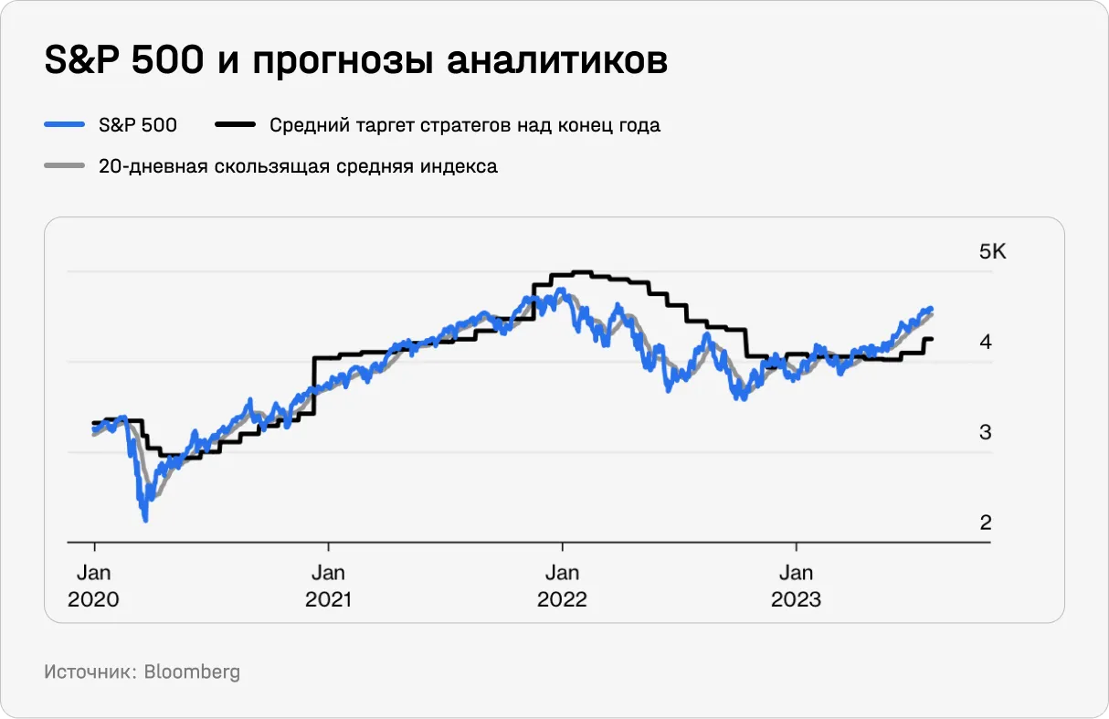 На сентимент, в свою очередь, влияют макрофакторы, которые трудно предсказывать, отмечает Николас Колас из DataTrek Research. Среди факторов, приведших к ошибке в прогнозе, Уилсон указал на хайп вокруг ИИ и увеличение баланса ФРС после краха нескольких региональных банков в марте — предсказать эти события было невозможно. Например, хоть крах банков и был логичным следствием роста ставок (подробнее о причинах мы рассказывали здесь), но стоило ожидать того, что в результате финансовые условия ужесточатся, а не наоборот.