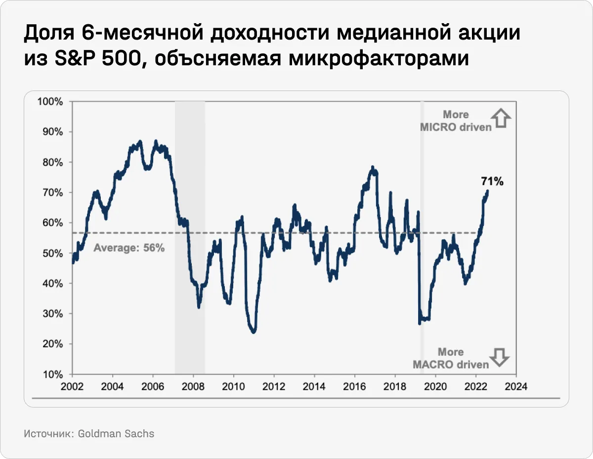 В результате дисперсия трехмесячной доходности акций из S&P 500 выросла с 5 п. п. до 29 п. п., что примерно равно среднему показателю за последние 30 лет (28 п. п.). При этом относительно последних 10 лет, когда волатильность на рынках была снижена за счет ультрамягкой денежно-кредитной политики, текущий показатель находится в 85-м процентиле. Иными словами, влияние микрофакторов становится все больше.