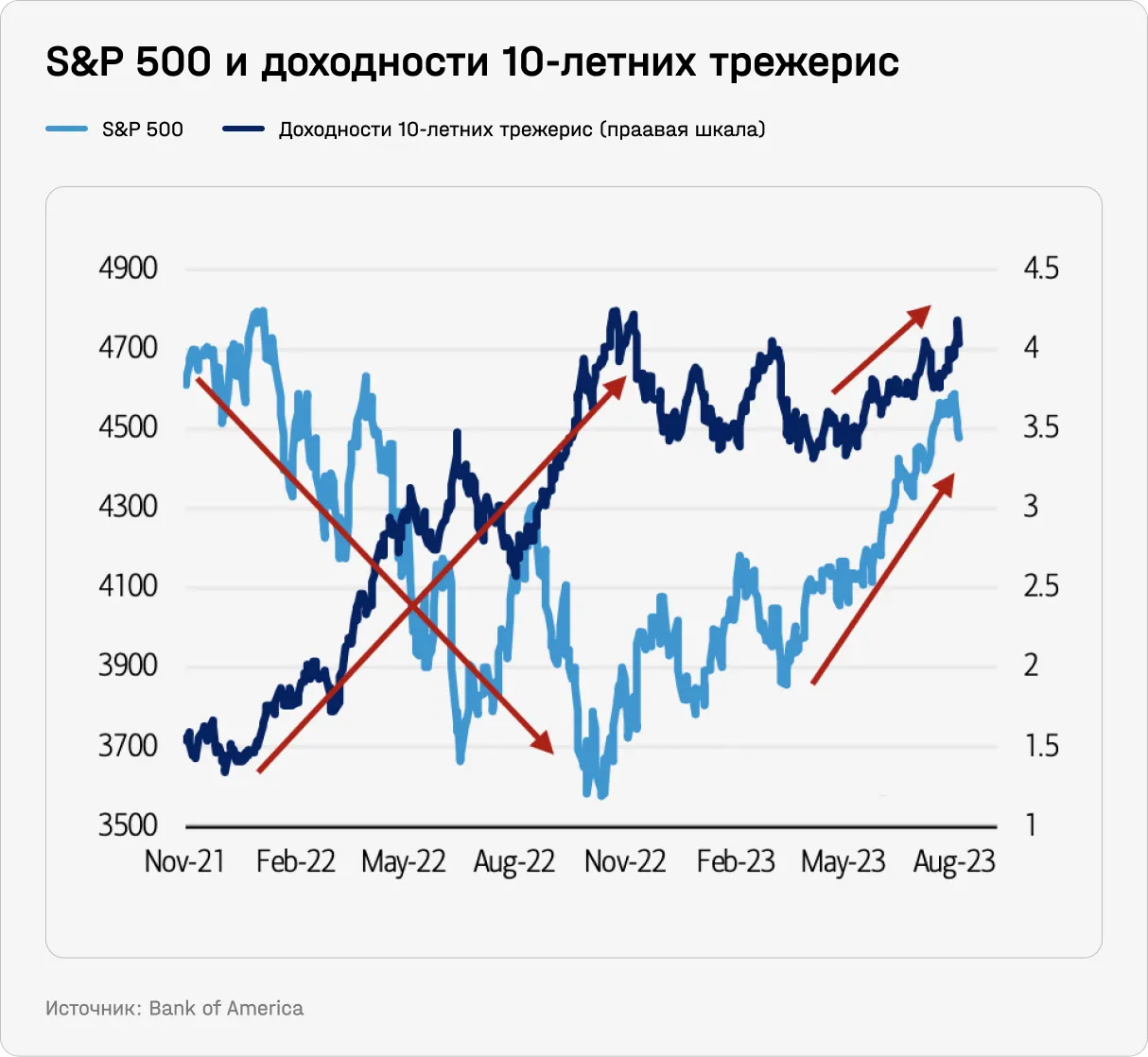 То, что рынок акций не реагирует на рост ставок, делающий облигации более привлекательными, — характерная картина для 2023-го. В 2022-м рост ставок был главной причиной падения рынка.