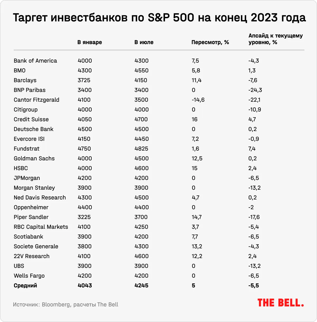 В результате многие стратеги — даже главные «медведи» вроде Майка Уилсона из Morgan Stanley, который прямо признал ошибку в прогнозе на этот год, — в июле были вынуждены капитулировать и увеличить таргеты по S&P 500 на конец года.