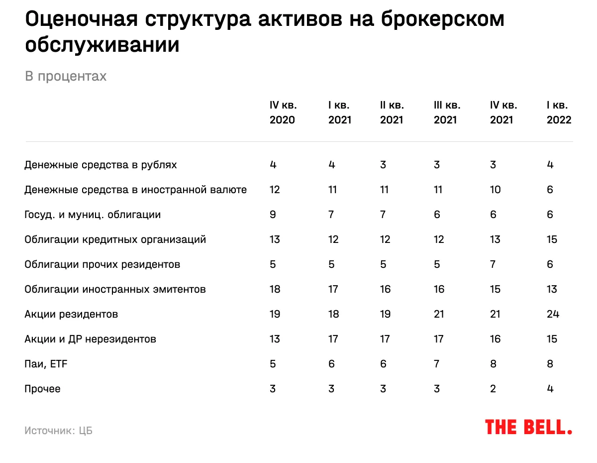 На иностранные бумаги — акции и облигации нерезидентов — по данным на конец 2021 года, приходился 31% всех активов на брокерском обслуживании. К концу первого квартала 2022 года этот показатель снизился до 28%, в том числе благодаря чистому оттоку из иностранных акций примерно на 200 млрд рублей, следует из вышедшего на днях обзора ЦБ. В нем оценочная стоимость ценных бумаг на счетах частных инвесторов уже не приводится.