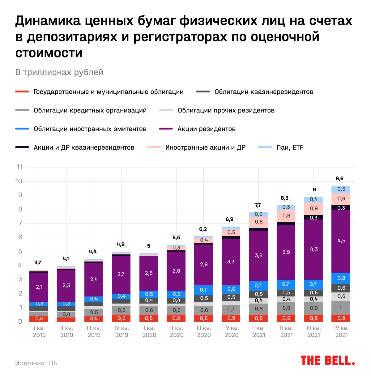 Блокировка иностранных бумаг воспринимается рынком крайне болезненно. В последние годы российские частные инвесторы активнее всего увеличивали вложения именно в них, и прежде всего в акции. Вo втором квартале 2020 года вложения в иностранные акции и депозитарные расписки составляли только 0,3 трлн рублей, а к концу 2021 года — уже 0,9 трлн. Еще 0,8 трлн по состоянию на конец прошлого года пришлись на вложения в облигации иностранных эмитентов, 0,6 трлн — облигации квазинерезидентов.