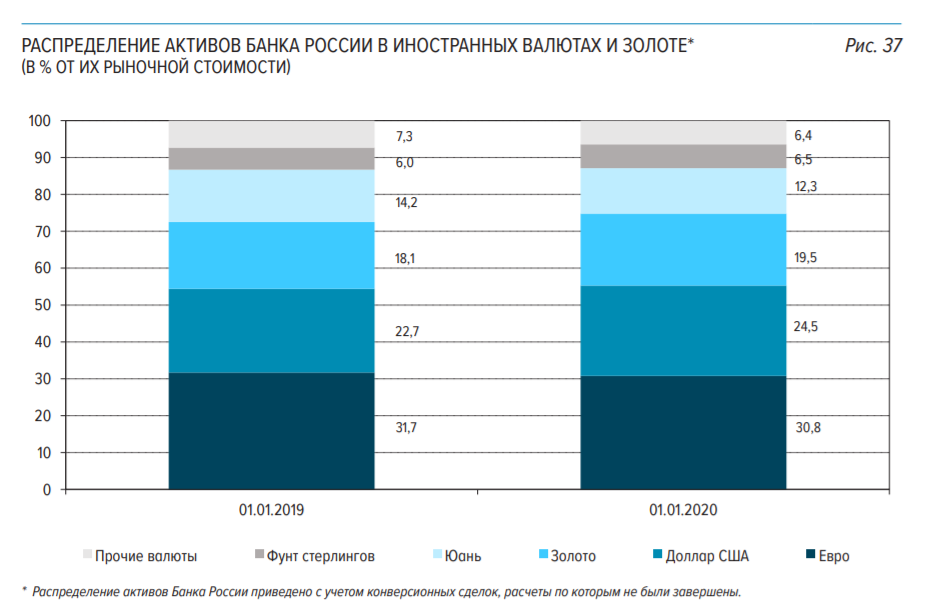 Банк России за год к началу 2020 года нарастил долю доллара США в международных резервах почти на 2 п.п., до 24,5%, сообщается в годовом отчете. На 1,4 п.п. подросла доля золота — до 19,5%.