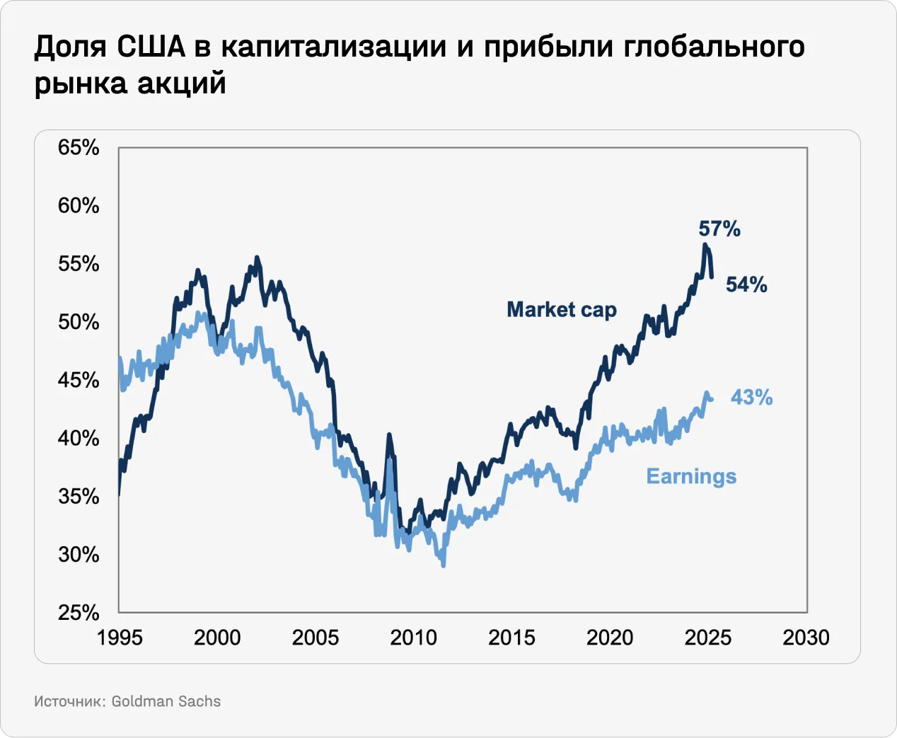 Теперь те, кто владеет американскими активами, начинают тревожиться из-за слишком большой зависимости от рынка США, пишет редактор Bloomberg Джон Отерс. Анализ GS показывает, что перед текущим разворотом доля США на мировом рынке акций достигла исторического максимума, превзойдя предыдущий рекорд эпохи доткомов.