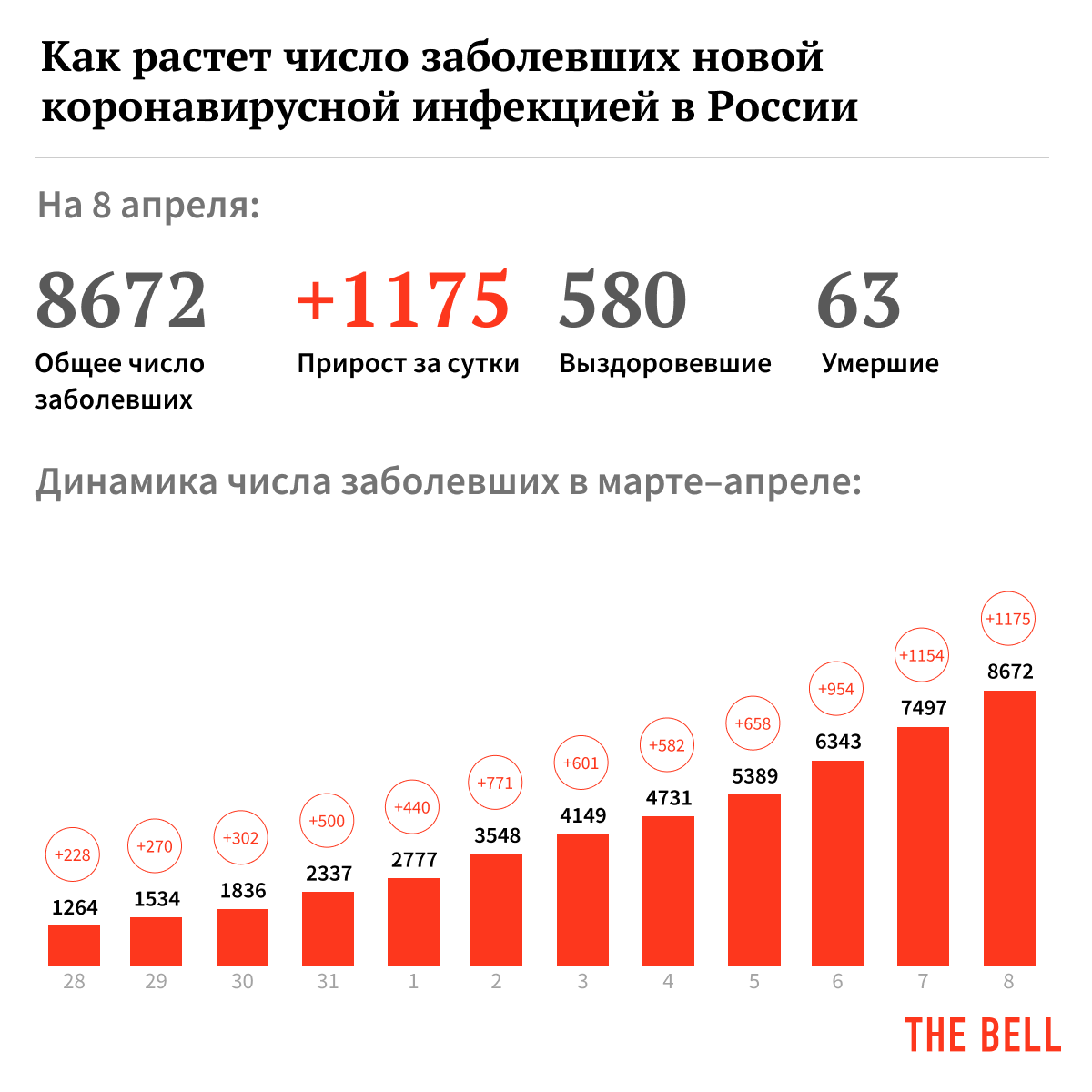 По данным оперштаба Москвы, в России за сутки на 8 апреля выявлено 1175 новых случаев коронавирусной инфекции. Всего в стране 8672 случаев.