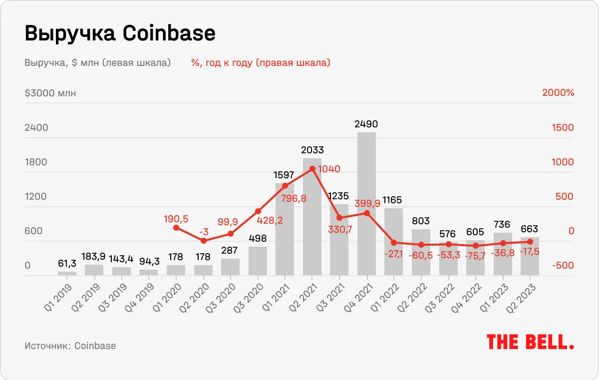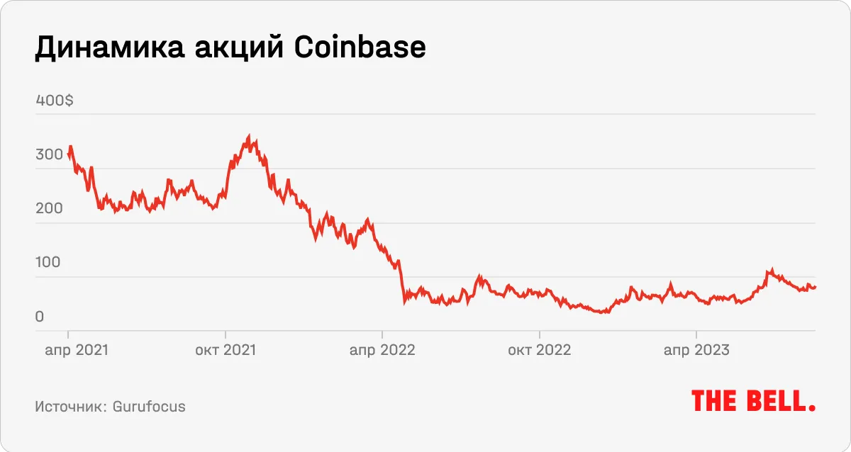 Резкое снижение цен на криптовалюты в 2022 году привело к сильному снижению объемов торгов и, как следствие, комиссий Coinbase. Если во время криптобума 2021 года Coinbase получила чистую прибыль в $3,6 млрд, то теперь компания убыточна: ее потери по итогам последнего квартала составили $97 млн. Правда, год назад ситуация была куда хуже: тогда квартальный убыток составил $1,09 млрд. Биржа резко продолжила сокращать операционные расходы: в 2022–2023 годах был уволен каждый пятый сотрудник. Однако, несмотря на это и рост биткоина, в этом году прибыль Coinbase не растет. Это является следствием проблем криптоиндустрии в целом, до сих пор не оправившейся после банкротства FTX и некоторых других криптопроектов и обвала цен на криптовалюты.