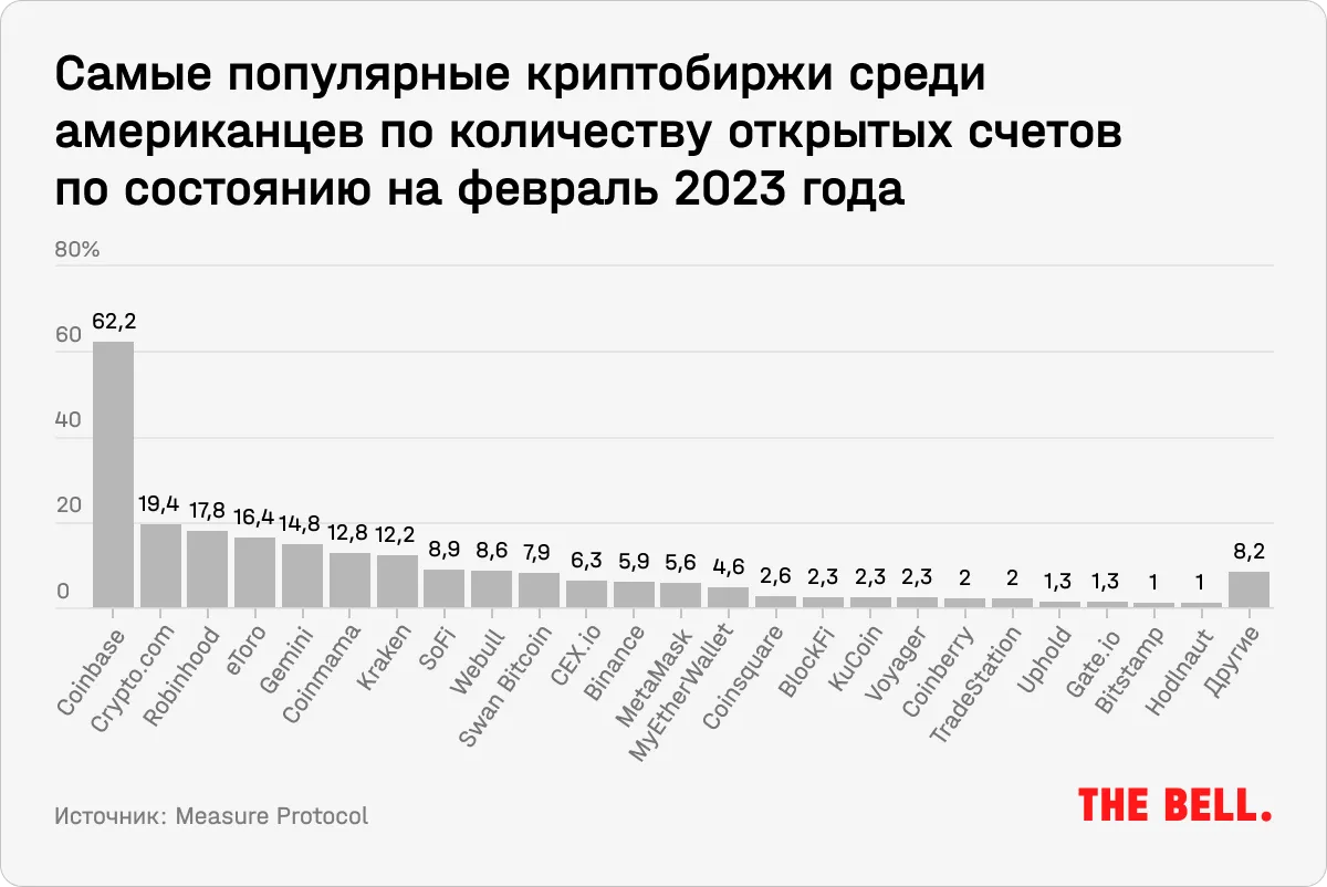 За последние годы Coinbase удалось диверсифицировать доходы от криптобизнеса. Примерно $327 млн из $708 млн выручки Coinbase за последний квартал обеспечили торговые комиссии, хотя еще в 2021-м на них приходилось примерно 86% выручки. На биткоин пришлось 40% общего объема торгов криптовалютами и 39% от выручки от трейдинговых комиссий.