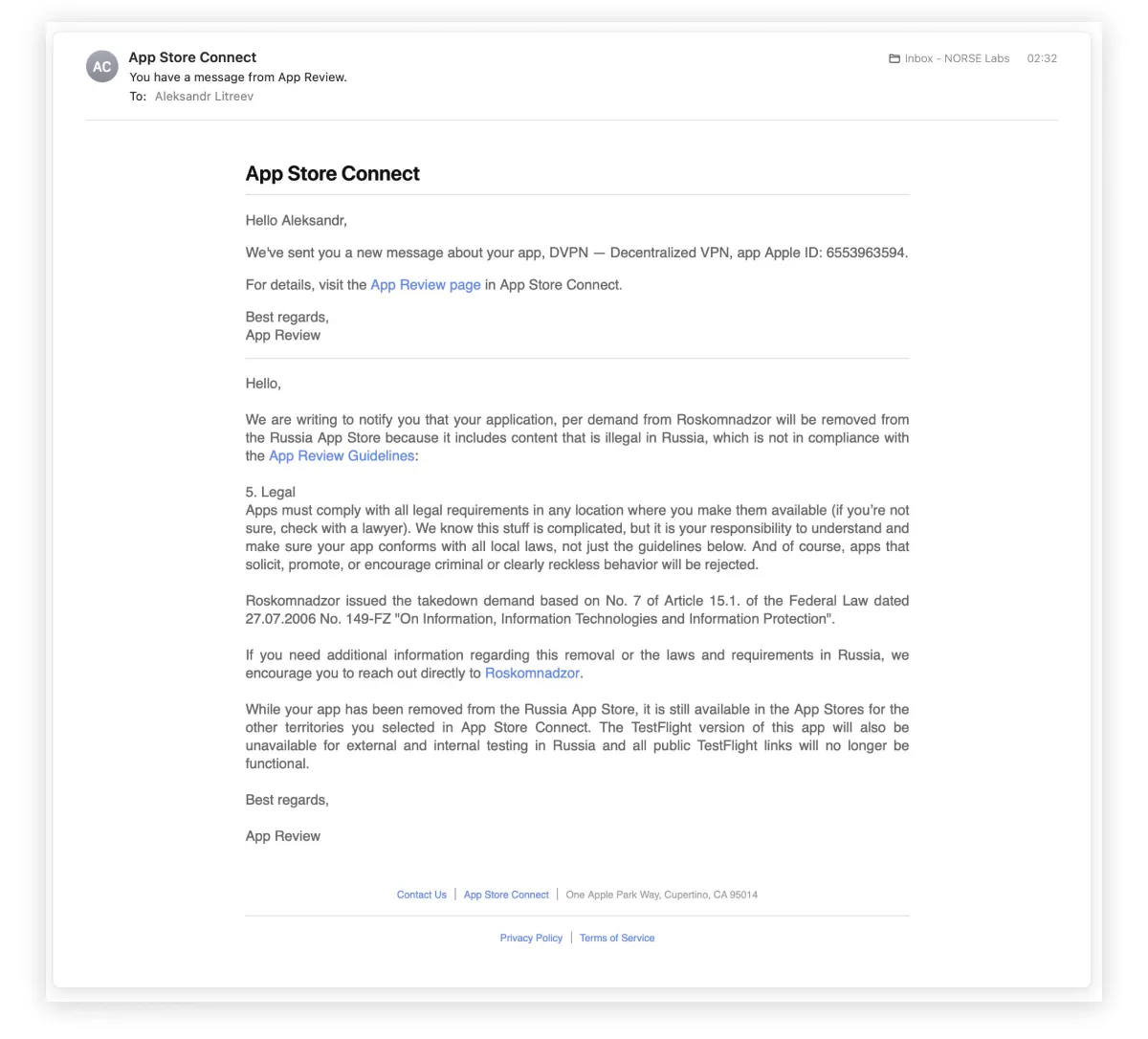 «VPN Гильдия» обнаружила запрос на удаление DVPN из Google Play в Lumen, архиве юридических запросов на удаление онлайн-контента. Автор запроса — Роскомнадзор, дата — 17 апреля. «Мы понимаем, что тема непростая, но это ваша ответственность — убедиться, что приложение соответствует всем местным законам», — говорится в письме Google, поступившем компании. На следующий день, 18 апреля, уже Apple удалила еще один VPN Литреева под названием Sentinel Shield dVPN, который был зарегистрирован на британское юрлицо.