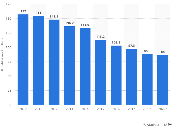 • У скепсиса топ-менеджера по отношению к персональным компьютерам есть основания: по статистике (график ниже), их продажи упорно падают из года в год. И, согласно прогнозам, меняться этот тренд не будет.