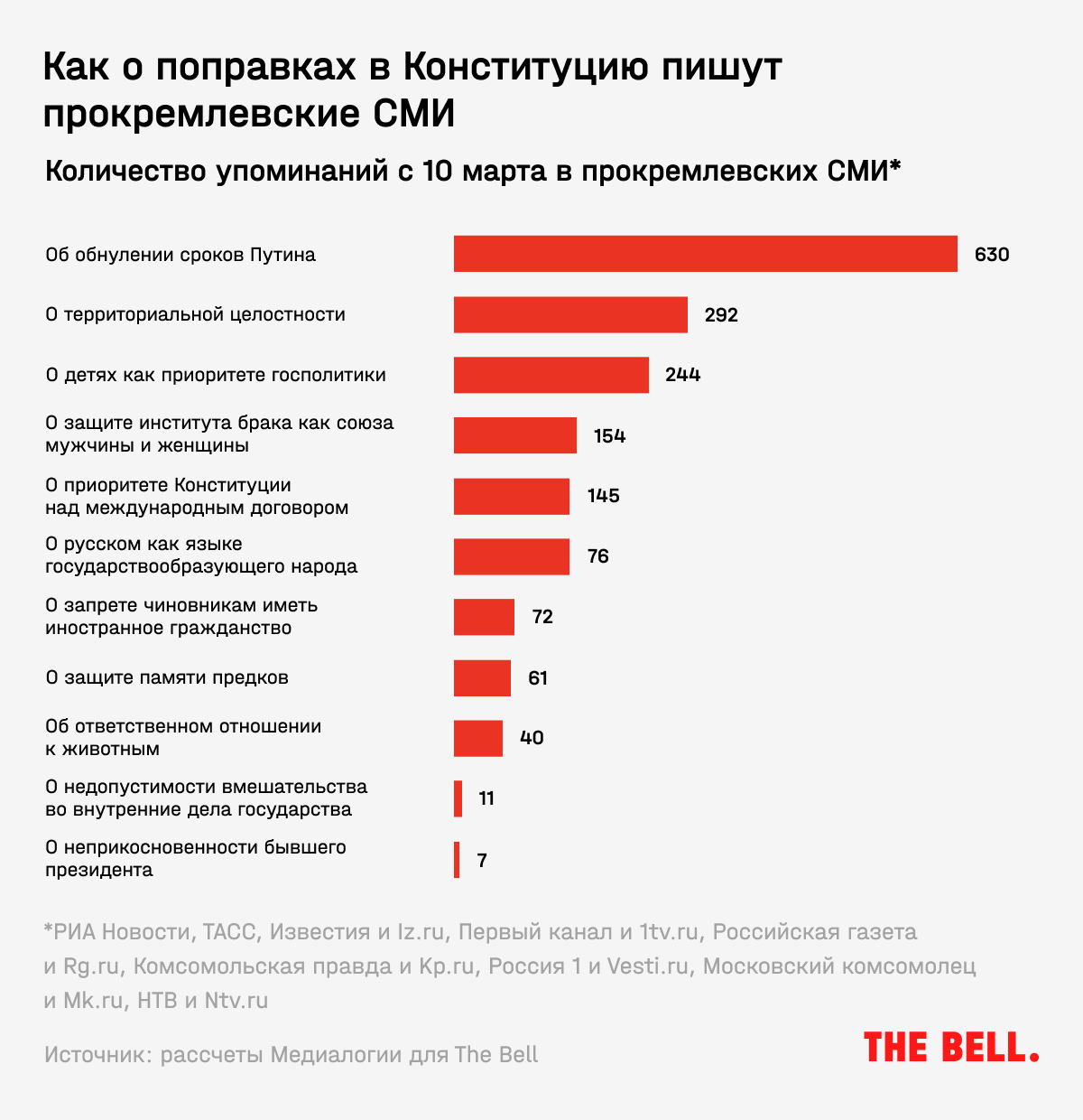 Пункт про обнуление сроков Путина, впрочем, не рекламируется в роликах и наружной рекламе ЦИК, а поначалу его не было даже на официальном сайте с перечнем всех поправок. Но официальные СМИ все равно не смогли сдержаться — анализ публикаций в провластных изданиях, проведенный «Медиалогией» по просьбе The Bell, показал, что о «путинской» поправке они упоминали вдвое чаще, чем о любой другой.
