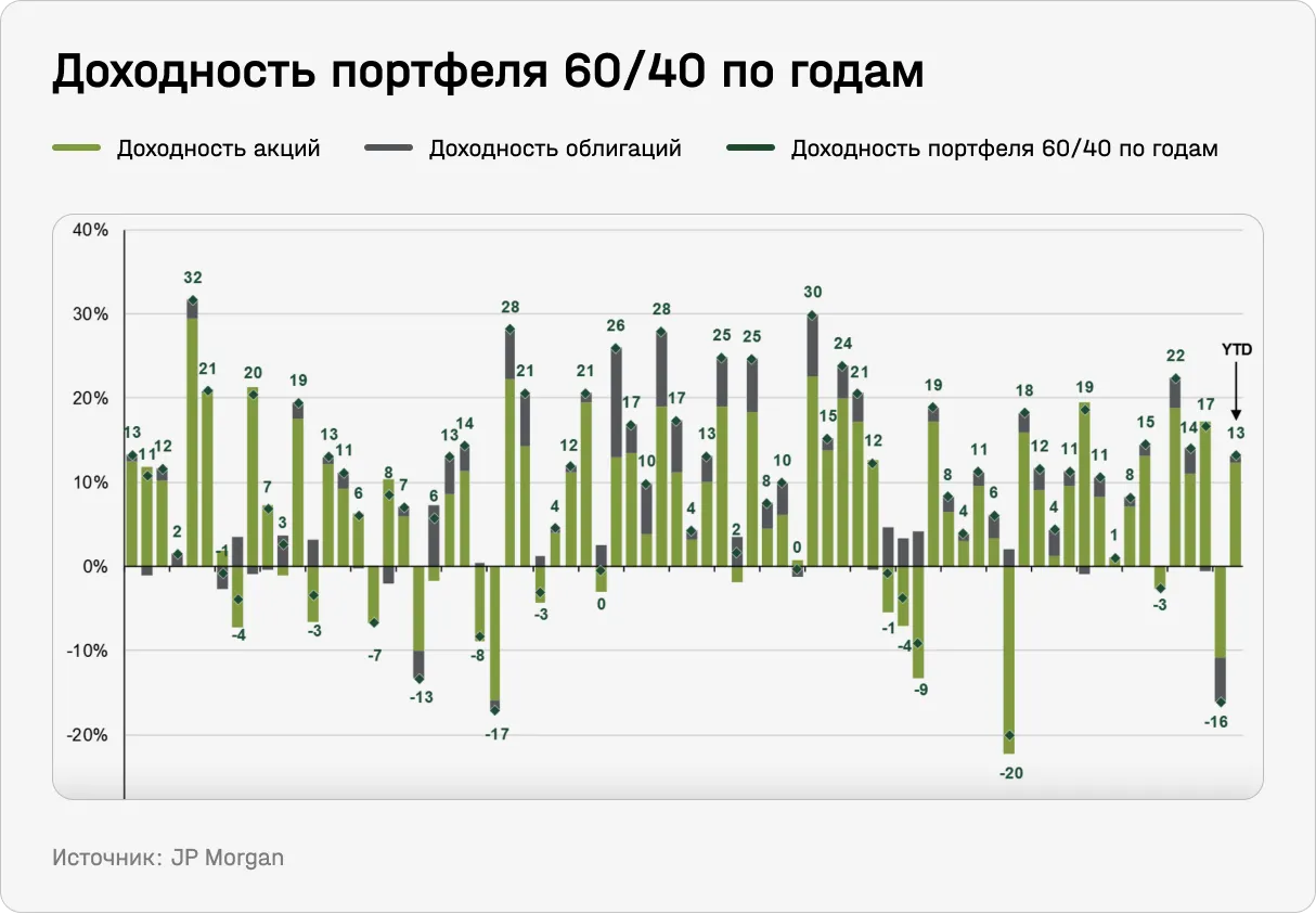 Однако все резко изменилось в 2022-м, когда глобальные центробанки начали цикл повышения ставок, пытаясь взять под контроль заоблачную инфляцию. По итогам 2022-го портфель 60/40 показал худшую доходность с 2008-го.