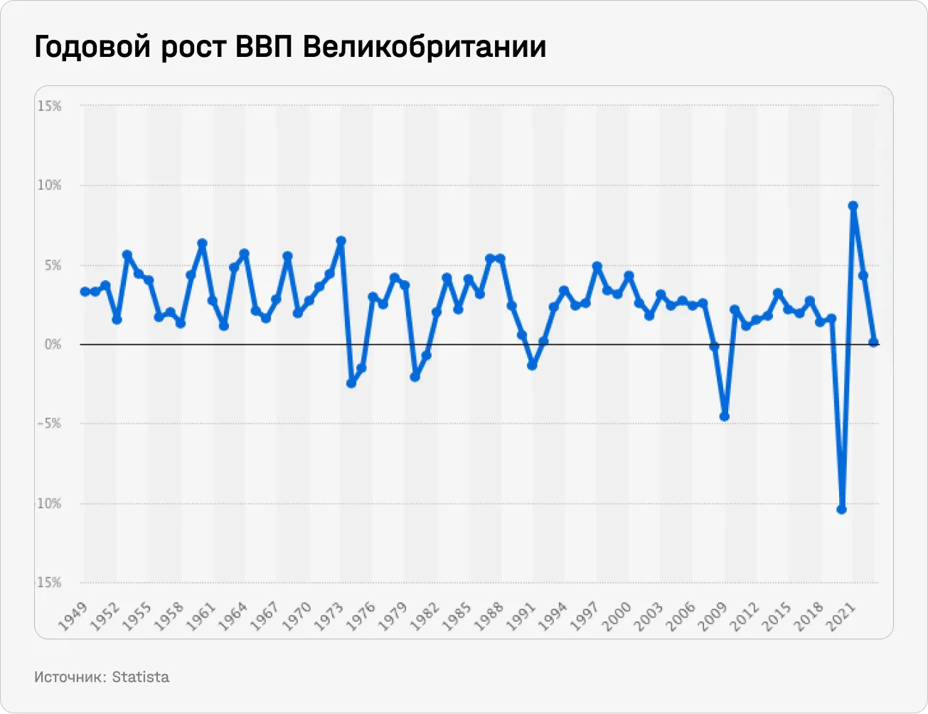 По экономике страны сильно ударила пандемия. В 2020 году Великобритания пережила крупнейшее падение ВВП в своей истории — на 10,4%. Дальше начался период восстановления, а темпы экономического роста были относительно высокими — 8,7% в 2021 году и 4,3% в 2022 году. Однако в 2023 году этот процесс явно застопорился.
