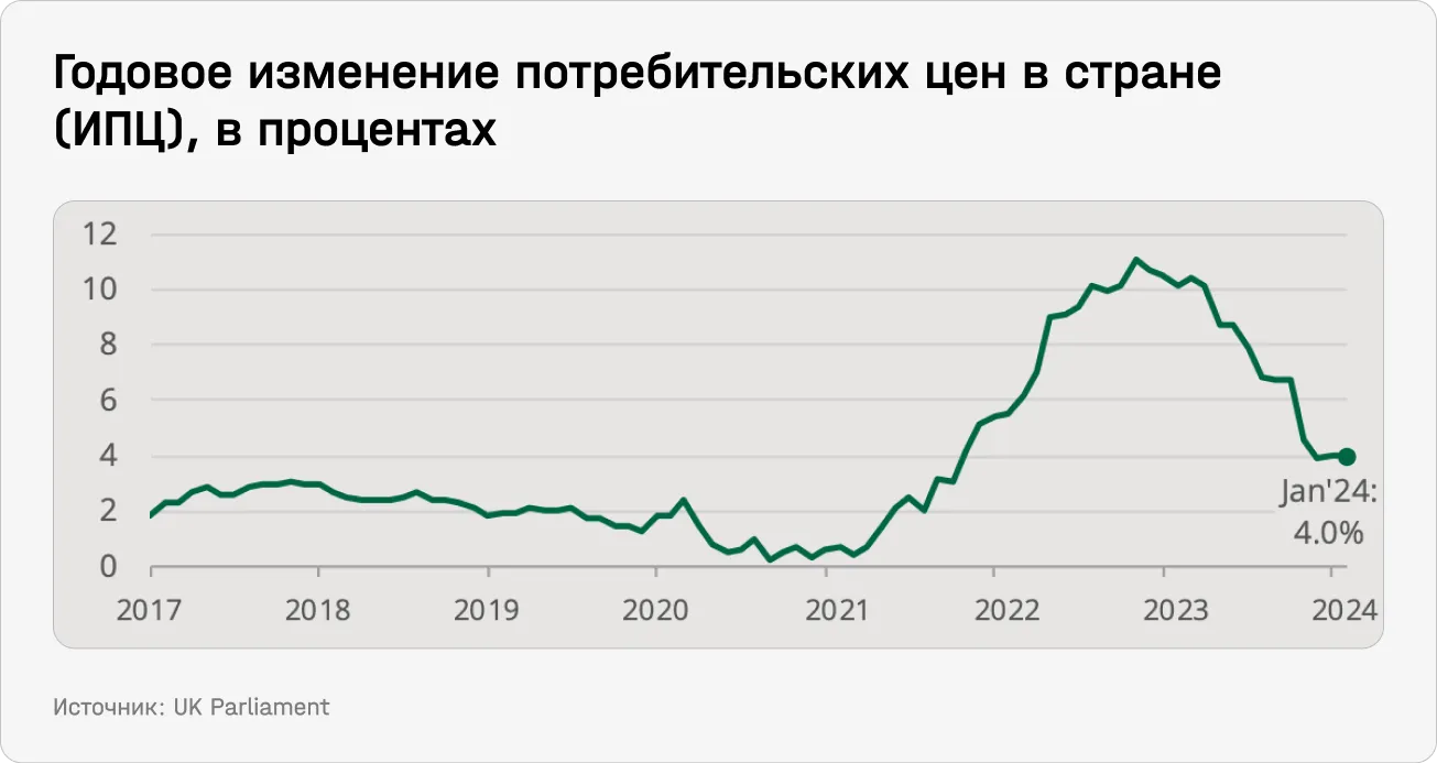 1. Устойчиво высокая инфляция. В октябре 2022 года инфляция достигла максимальных за 41 год 11,1%. После этого ее уровень начал падать — и ожидается, что продолжит идти вниз в 2024 году. Банк Англии ожидает, что инфляция достигнет целевого показателя в 2% в последнем квартале 2026 года.