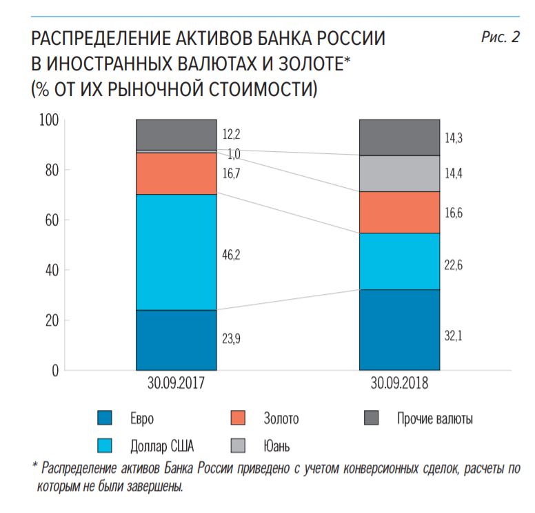 - В 2017–2018 годах, в ожидании новых санкций США, ЦБ резко изменил структуру резервов. Доля доллара снизилась вдвое — с 46,2% до 22,6%, доля евро выросла с 23,9% до 32,1%, доля юаня — с 1% до 14,4%.